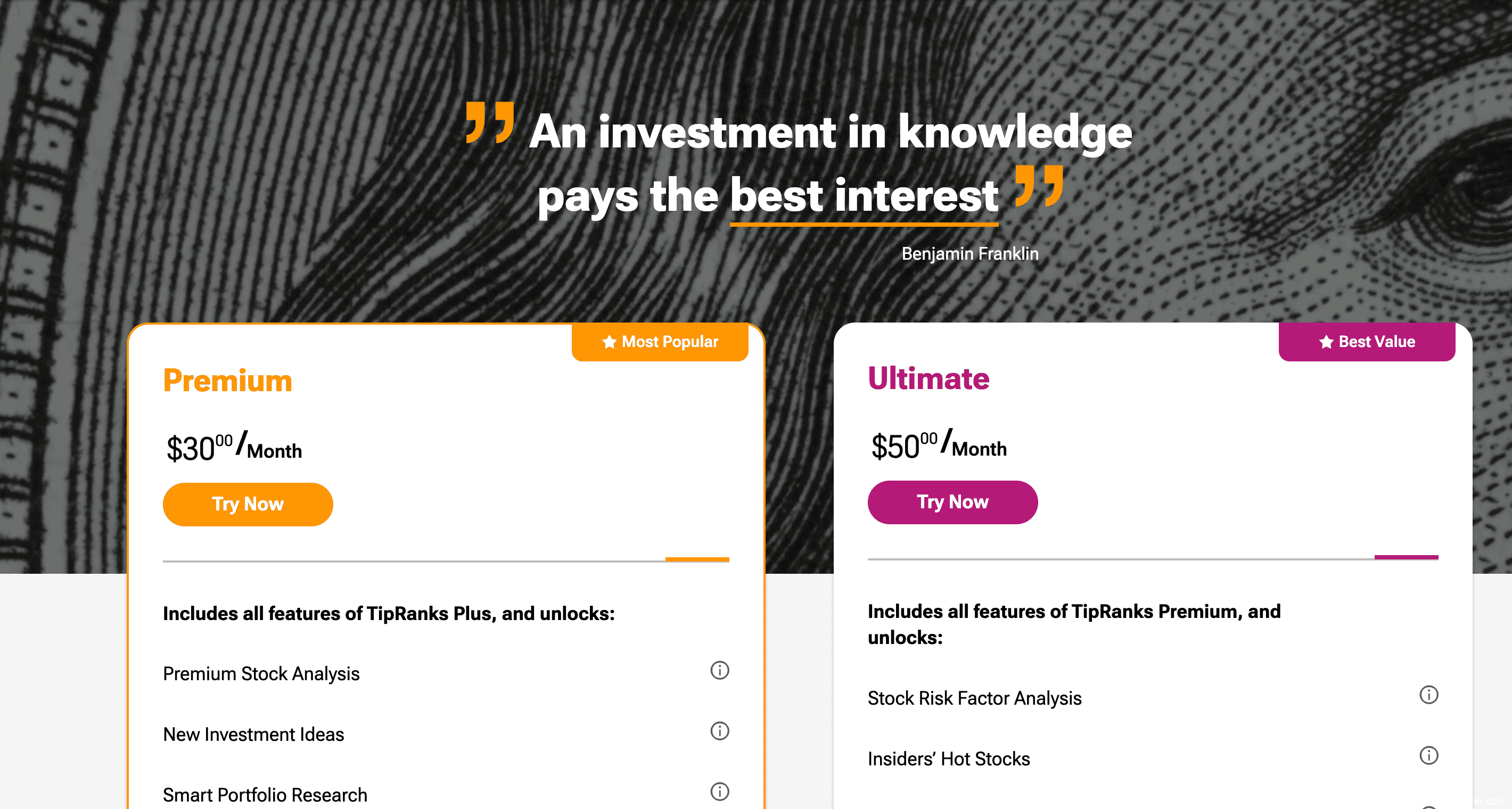 | Ultimate | 50/month | Includes all features of TipRanks Premium, and unlocks: – Stock Risk Factor Analysis – Insiders’ Hot Stocks – Popular Websites Screener – Research Firm Rankings – Complete Expert Rankings – Unlimited Email Alerts – PDF + CSV Export – VIP Support – 30-day money-back guarantee |